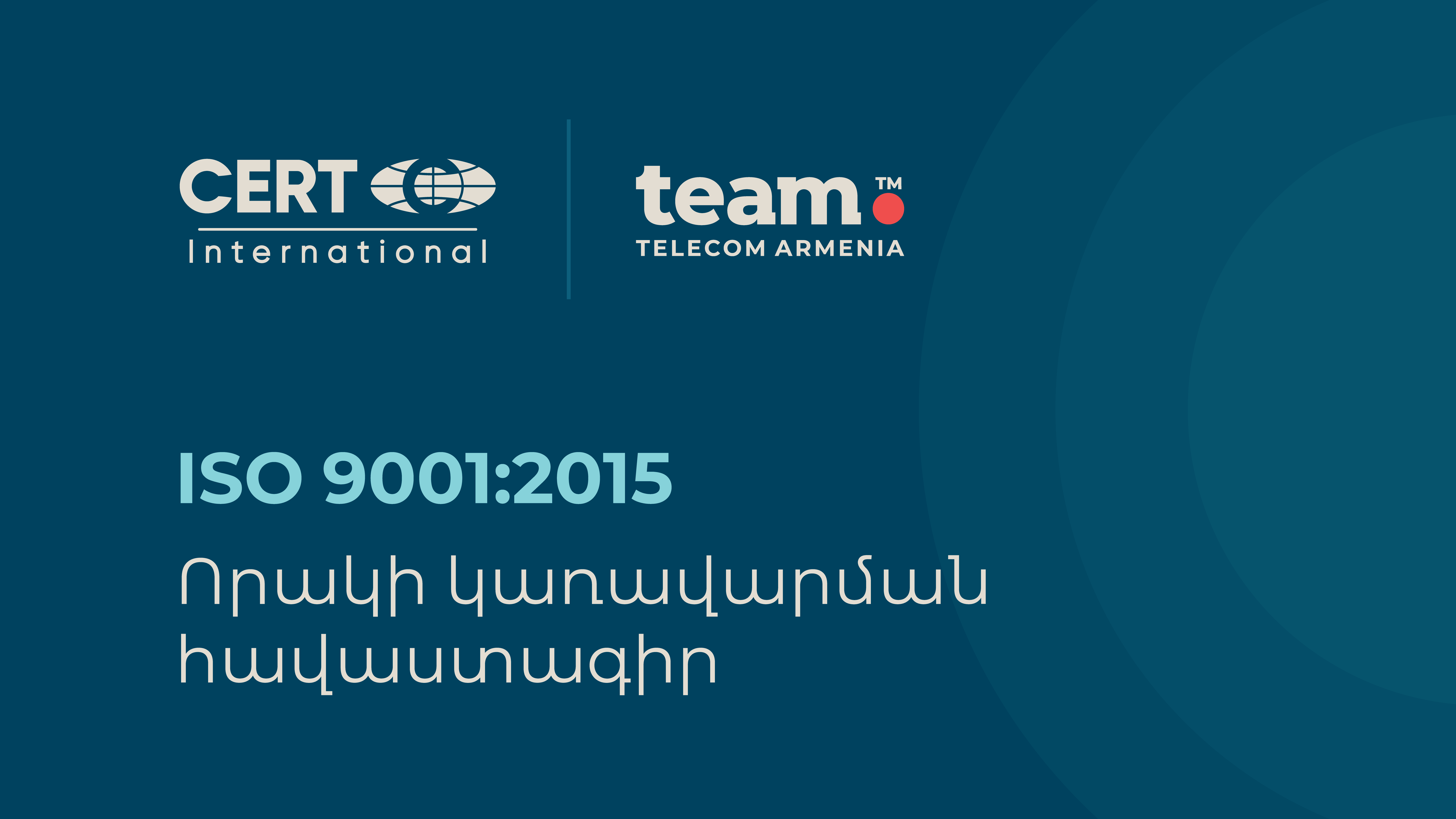 ISO 9001:2015-ը վկայում է, որ Team Telecom Armenia-ն, հավատարիմ լինելով բարձրորակ ծառայությունների տրամադրման սկզբունքին, մշտապես աշխատում է հեռահաղորդակցության ոլորտային գործընթացների բարելավման և արդյունավետության բարձրացման, ինչպես նաև շուկայական վստահության ամրապնդման և միջազգային գործընկերների հետ համագործակցության ընդլայնման ուղղությամբ: