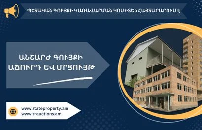 Պետական գույքի կառավարման կոմիտեն https://www.e-auctions.am/ պետական գույքի էլեկտրոնային աճուրդի համակարգի միջոցով, ինչպես նաև մրցութային կարգով, օտարման է ներկայացրել Երևանում և ՀՀ մարզերում գտնվող մի շարք անշարժ գույքեր։