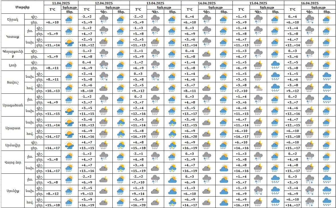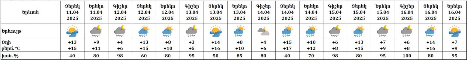 Երևանում ապրիլի 12-14-ը սպասվում է կարճատև անձրև, 15-16-ին՝ անձրև, հնարավոր է նաև ամպրոպ։ Ապրիլի 12-ին սպասվում է քամու ուժգնացում՝ 10-13 մ/վ արագությամբ։