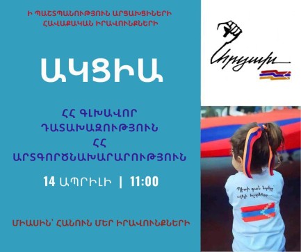 ArmLur.am-ի տեղեկությունների համաձայն` Արցախցիների իրավունքների պաշտպանության խորհուրդը ապրիլի 14-ին, ժամը 11:00-ին նախատեսում է բողոքի ակցիաներ իրականացնել ՀՀ ԱԳՆ և Դատախազության շենքերի դիմաց; Ինչպես հայտնումէ Արցախցիների իրավունքների խորհուրդը՝ ԱԳՆ-ից պահանջները հետևյալն են.