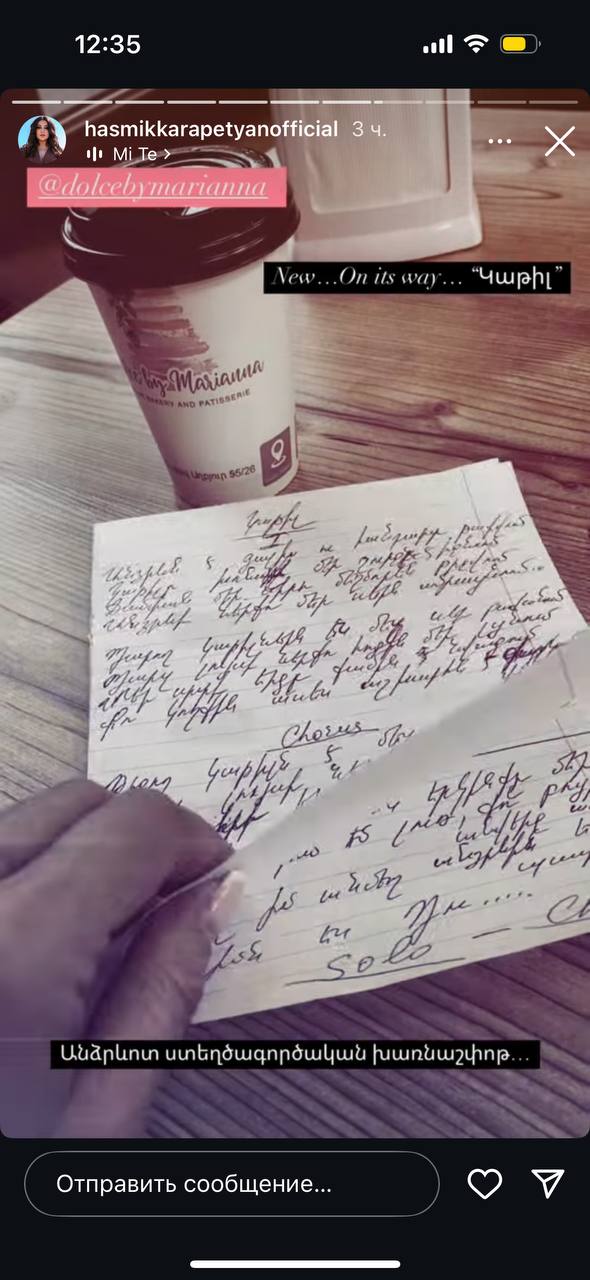 Երգչուհի Հասմիկ Կարապետյանն իր ինստագրամյան միկրոբլոգի սթորիների բաժնում նորությունով է կիսվել։