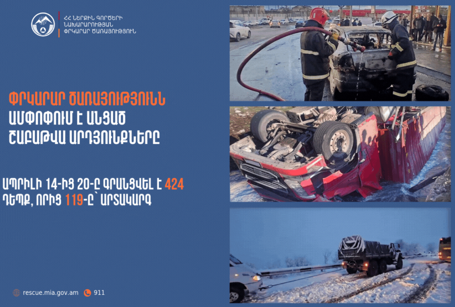 Ապրիլի 14-20-ը ՆԳՆ ՓԾ ճգնաժամային կառավարման ազգային կենտրոնում գրանցվել է 424 դեպք, որից 119-ը՝ արտակարգ: