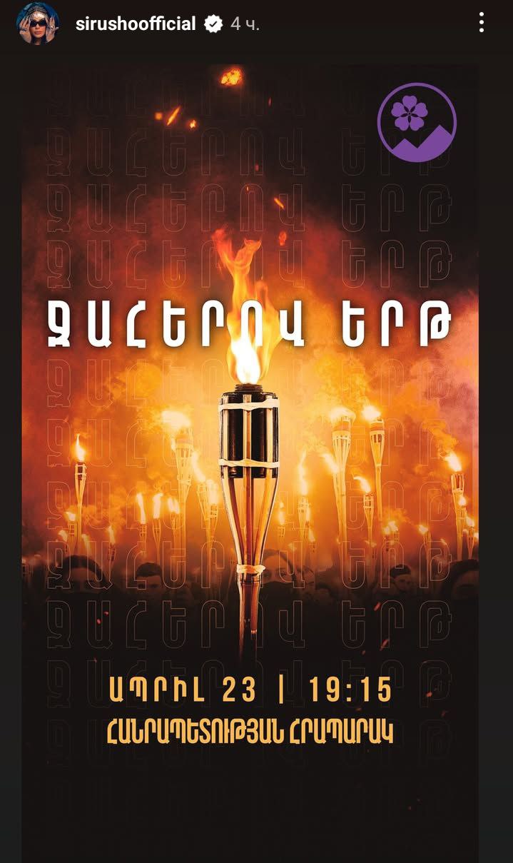 Սիրված երգչուհի Սիրուշոն կոչ է արել մասնակցել Ջահերով երթին։ Նա ինստագրամյան stories բաժնում կիսվել է թեմատիկ լուսանկարով: