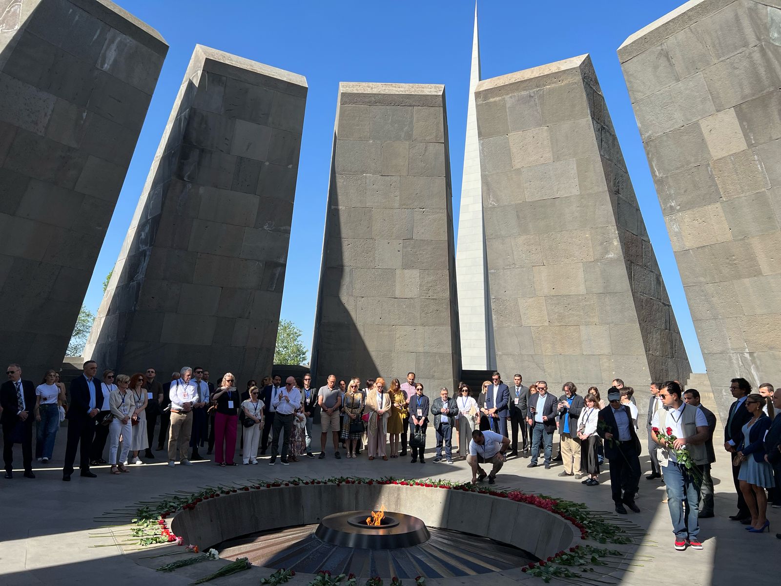 Շուրջ 40 պետությունից ավելի քան 70 պատվիրակի դիմավորել է Հայոց ցեղասպանության թանգարան-ինստիտուտի տնօրեն Էդիտա Գզոյանը և ուղեկցել դեպի Հայոց ցեղասպանության հուշահամալիր՝ ներկայացնելով հուշահամալիրի ստեղծման պատմությունը: ՀՑԹԻ տնօրենն անդրադարձ է կատարել նաև Ծիծեռնակաբերդի տարածքում անցյալ դարավերջին Ադրբեջանի Սումգայիթ, Կիրովաբադ (Գանձակ), Բաքու քաղաքներում ադրբեջանական կառավարության կազմակերպած կոտորածներին զոհ գնացած հայերի հիշատակին տեղադրված երեք խաչքարերին՝ շեշտելով կապը տեղի ունեցածի և Հայոց ցեղասպանության միջև: