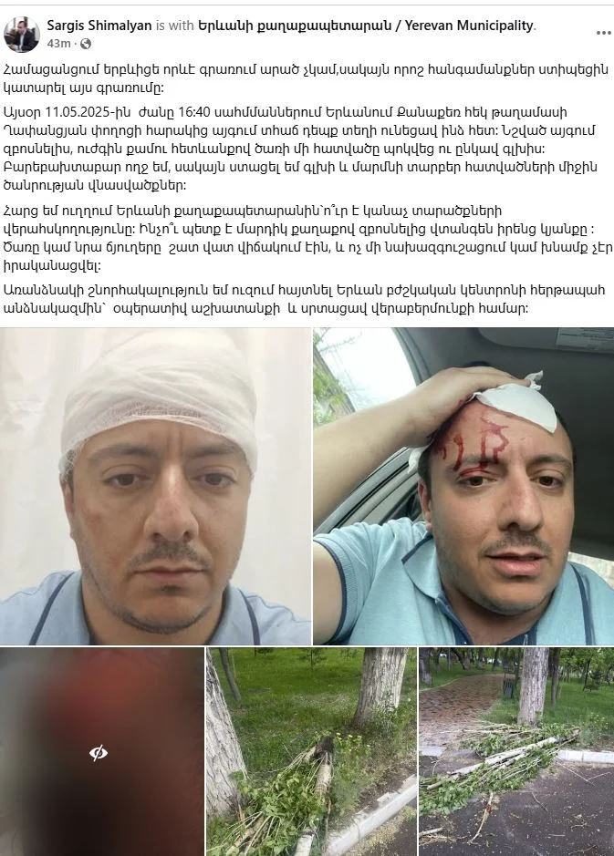 «Այսօր 11.05.2025-ին ժամը 16։40 սահմմաններում Երևանում Քանաքեռ հեկ թաղամասի Ղափանցյան փողոցի հարակից այգում տհաճ դեպք տեղի ունեցավ ինձ հետ։ Նշված այգում զբոսնելիս, ուժգին քամու հետևանքով ծառի մի հատվածը պոկվեց ու ընկավ գլխիս։ Բարեբախտաբար ողջ եմ, սակայն ստացել եմ գլխի և մարմնի տարբեր հատվածների միջին ծանրության վնասվածքներ։