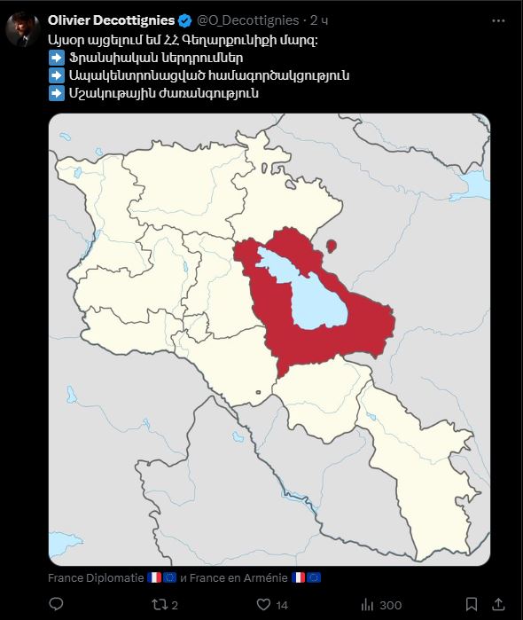 Այս մասին Ֆրանսիայի դեսպանը նշել է X-ի իր միկրոբլոգում կատարած գրառման մեջ։