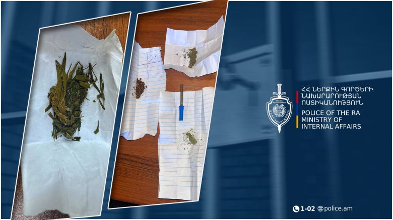 40-ամյա վարորդն ու 38-ամյա ուղևորը ձերբակալվել և տեղափոխվել են բաժին։ Վարորդի անձնական խուզարկությամբ հայտնաբերված ծխախոտի տուփերում մոխրացած հետքերով կաթուցիչ և թմրանյութի նմանվող ավելի քան հինգ գրամ զանգված կար։ Ուղևորի անձնական խուզարկությամբ հայտնաբերվել է թմրանյութի նմանվող 1,75 գրամ զանգված։