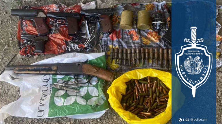 Մեկնած ոստիկանները ռեստորանի հետնամասում գտնվող կիսաքանդ շինությունում հայտնաբերել են տարբեր տեսակի, այդ թվում՝ «Մակարով» ատրճանակներ, հրացան, երեք նռնակ, նռնակի երկու պայթուցիչ, ինքնաձիգի պահեստատուփ, 195 փամփուշտ և գնդացրի փամփուշտների շղթա։