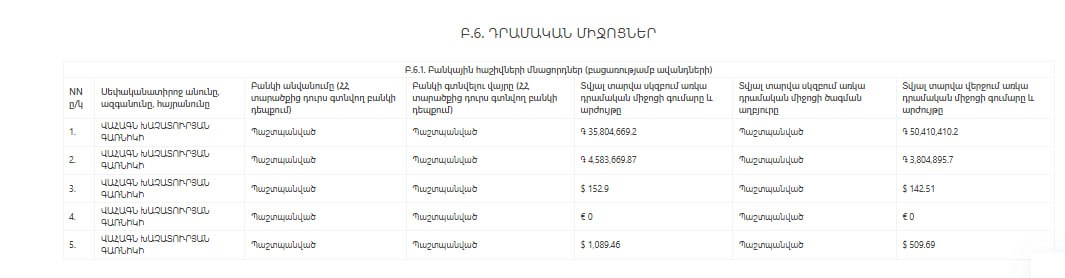2021 թվականին բանկային հաշիվների մնացորդները կազմել էին 19,2 մլն դրամ։