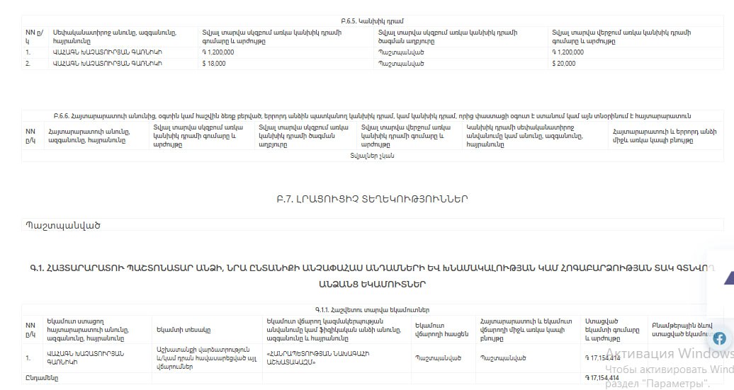 Հաշվետու տարվա եկամուտները կազմել են 17 մլն 154 հազար դրամ, որը աշխատանքի վարձատրություն է ՀՀ նախագահի աշխատակազմից։