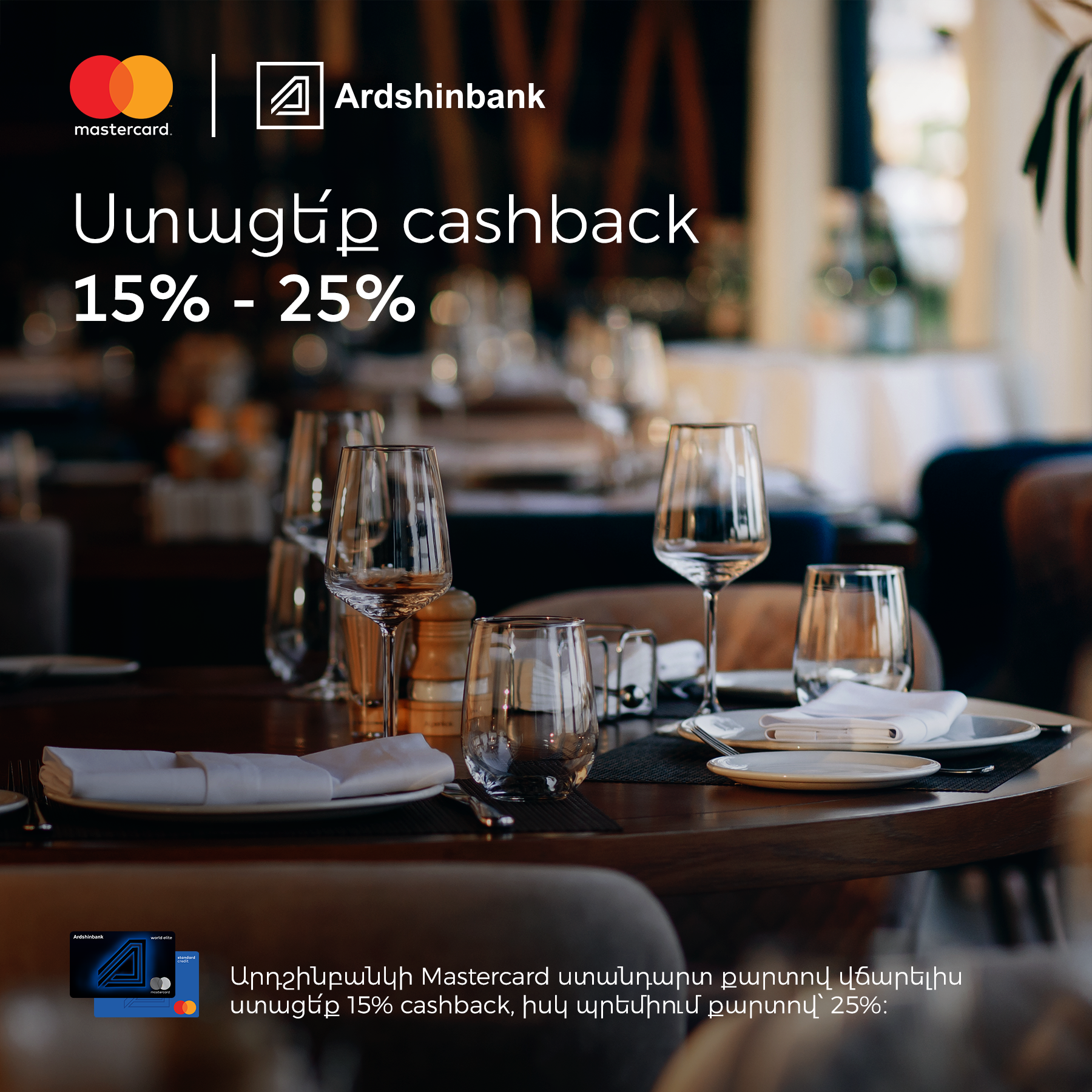 Ակցիայի շրջանակում Արդշինբանկի Mastercard բոլոր քարտապանները, ովքեր հունիսի 2-ից սեպտեմբերի 2-ը Արդշինբանկի POS տերմինալներով անկախիկ վճարումներ կկատարեն Park Cafe, Syrovarnya, T Philosophy, August, Ramen-Ten, Keg & Barrel, Zazoo, Persona Restaurant and Bar, 782, Yasaman (Ծաղկաձոր) և Ginetun ռեստորաններում, կստանան 15-25% cashback։