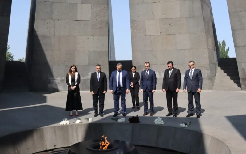 Հյուրերին դիմավորեց Հայոց ցեղասպանության թանգարան-ինստիտուտի տնօրեն Էդիտա Գզոյանը և ուղեկցեց դեպի Հայոց ցեղասպանության հուշահամալիր՝ ներկայացնելով հուշահամալիրի ստեղծման պատմությունը: ՀՑԹԻ տնօրենն անդրադարձ կատարեց նաև Ծիծեռնակաբերդի տարածքում անցյալ դարավերջին Ադրբեջանի Սումգայիթ, Կիրովաբադ (Գանձակ), Բաքու քաղաքներում ադրբեջանական կառավարության կազմակերպած կոտորածներին զոհ գնացած հայերի հիշատակին տեղադրված երեք խաչքարերի և Արցախյան գոյամարտի տարիներին Հուշապատի դիմացի հատվածում հուղարկավորված հինգ ազատամարտիկների պատմություններին՝ շեշտելով կապը տեղի ունեցածի և Հայոց ցեղասպանության միջև: