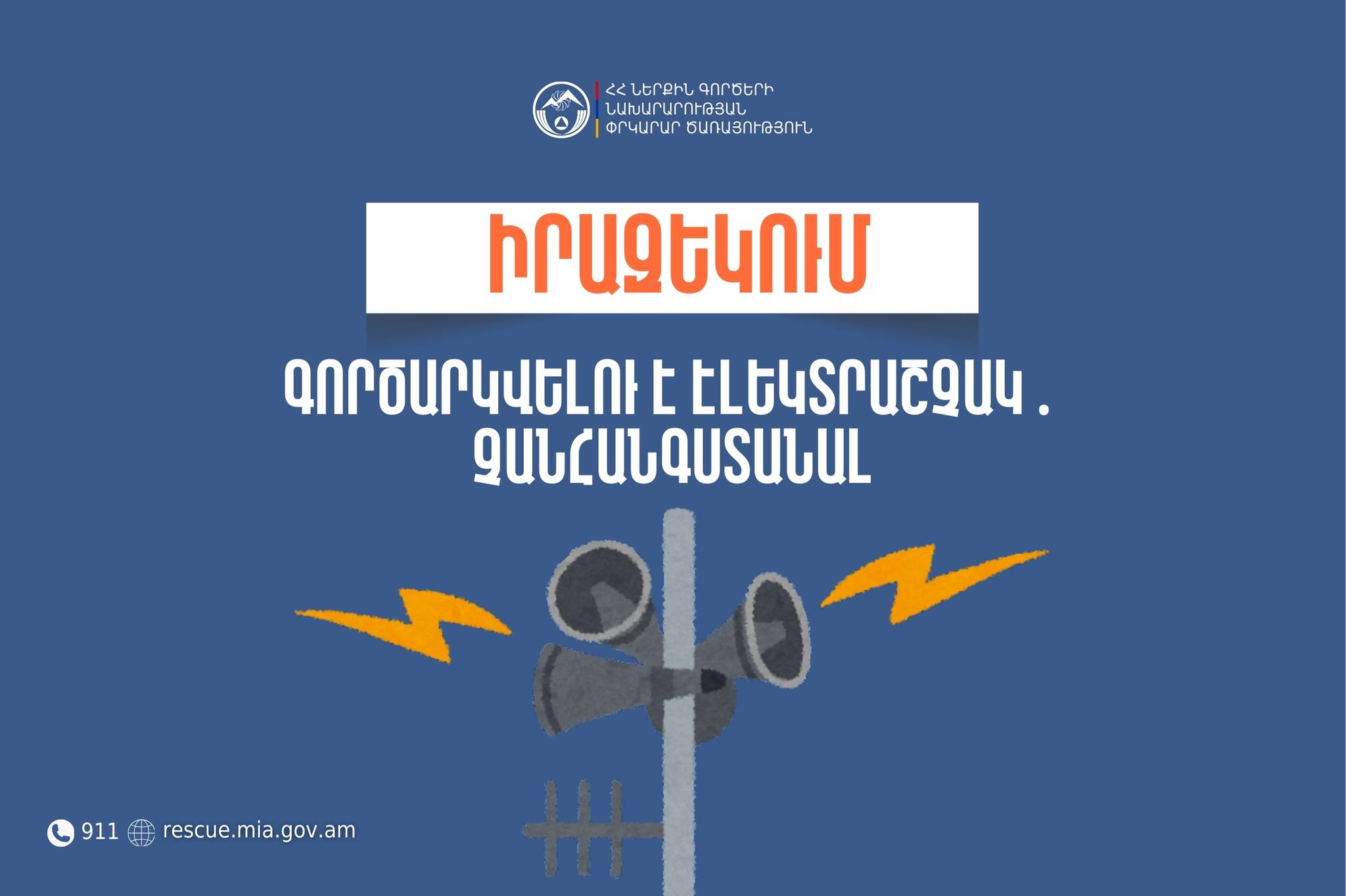 Հունիսի 13-ին՝ ժամը 10:00-ից մինչև 15:00-ն ընկած ժամանակահատվածում, Տավուշի մարզի Նոյեմբերյան համայնքի Դովեղ բնակավայրում անցկացվելու է ««Օդային տագնապ» ազդանշանի դեպքում բնակչության ազդարարման, պատսպարման և տարհանման աշխատանքների կազմակերպումը» թեմայով վարժանք, որի ընթացքում՝ ժամը 12:00-ին, գործարկվելու է էլեկտրական շչակ։