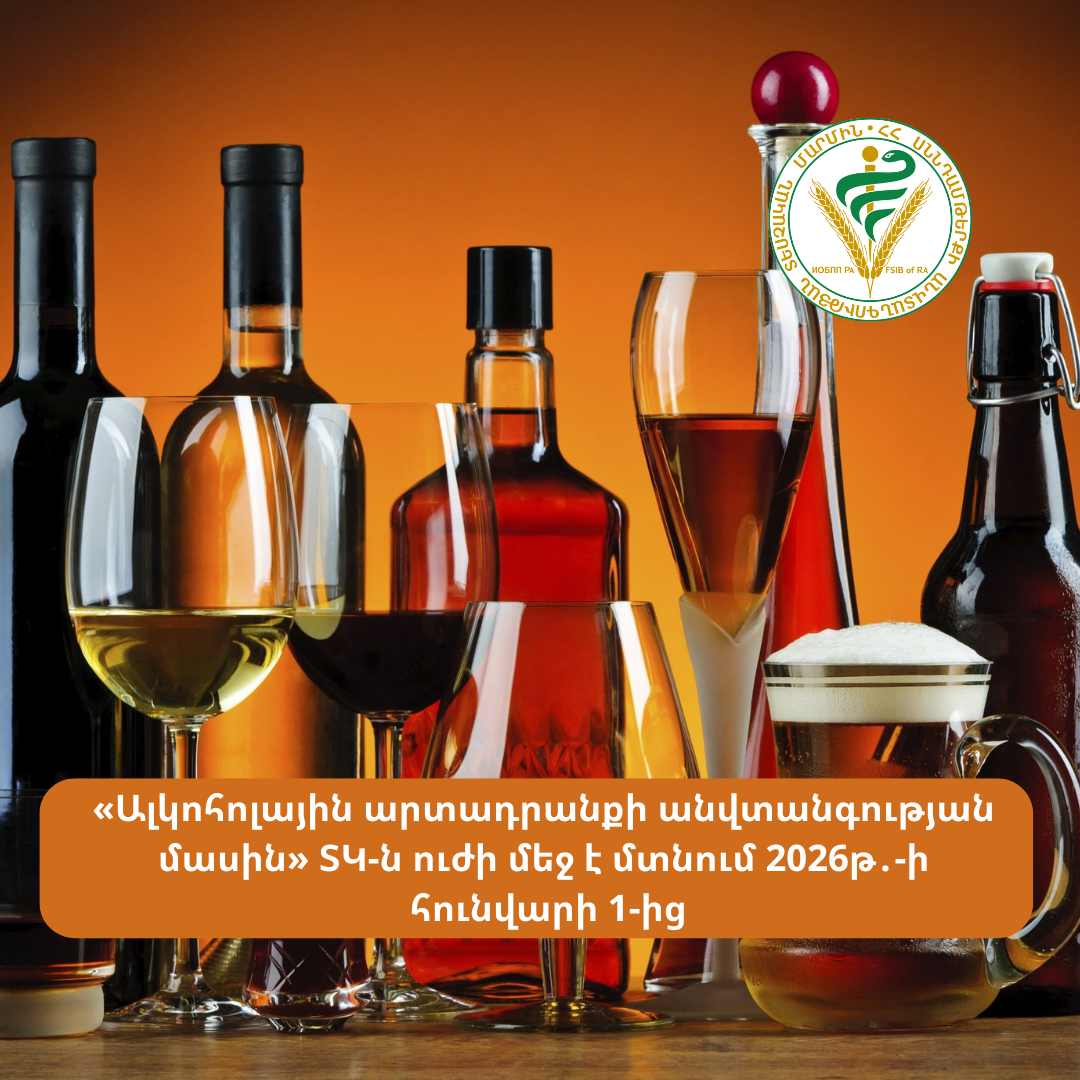 ՀՀ սննդամթերքի անվտանգության տեսչական մարմինը հիշեցնում է, որ 2018 թվականին հաստատված Եվրասիական տնտեսական միության «Ալկոհոլային արտադրանքի անվտանգության մասին» 047 տեխնիկական կանոնակարգի ուժի մեջ մտնելու ժամկետը հետաձգվել է. ԵԱՏՄ 2025թ․ փետրվարի 21-ի թիվ 21 որոշման համաձայն՝ այն 2025 թվականի հուլիսի 1-ի փոխարեն ուժի մեջ է մտնելու 2026թ․ հունվարի 1-ից։