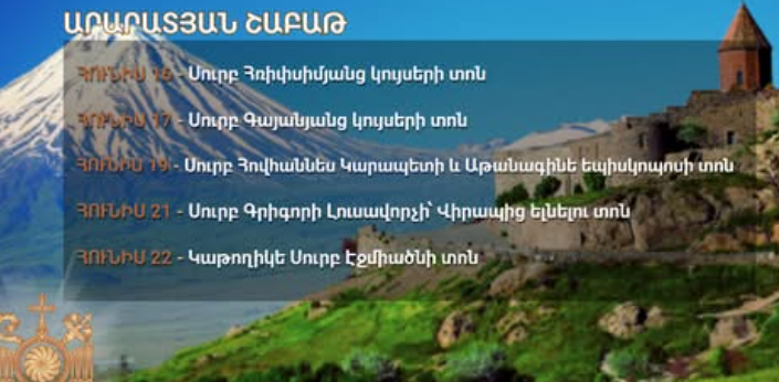 2025 թ. հունիսի 16-22-ը Հայաստանյայց Առաքելական Սուրբ Եկեղեցին նշելու է Արարատյան շաբաթվա տոները, որոնց առիթով Ն․Ս․Օ․Տ․Տ․ Գարեգին Երկրորդ Ծայրագույն Պատրիարք և Ամենայն Հայոց Կաթողիկոսի օրհնությամբ հավատացելոց երկրպագության համար դուրս կբերվեն Սուրբ Էջմիածնի սրբազան մասունքներ: