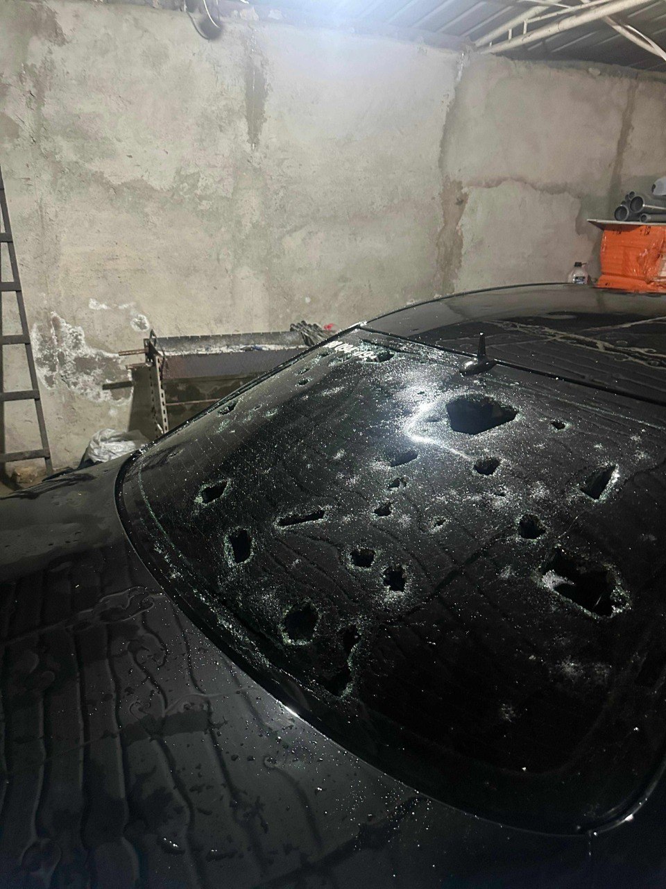 Լուսանկարում երեւում է, թե ուժեղ կարկուտն ինչպես է կոտրել մեքենայի հետնապակին: