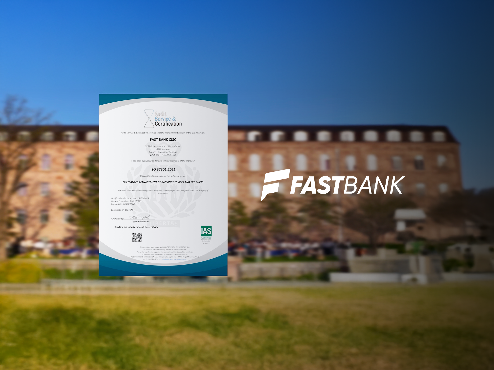 Ֆասթ Բանկին Audit Service & Certification միջազգային ընկերության կողմից շնորհվել է ISO 37301:2021 ստանդարտի համապատասխանության հավաստագիր։ Վկայագիրը փաստում է Ֆասթ Բանկի համապատասխանության կառավարման համակարգի (Compliance Management System), ինչպես նաև դրա պահպանման ու արդյունավետ աշխատանքի առկայությունը։