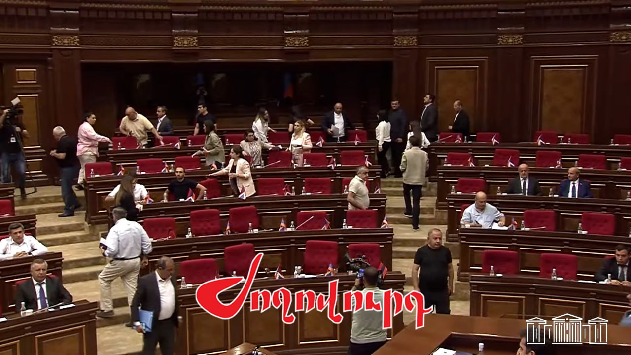 «Հայաստան» խմբակցության ղեկավար Սեյրան Օհանյանի անձեռնմխելիությունից զրկելու` Դատախազի ներկայացրած միջնորդագիրը քննարկելու հարցի ժամանակ ԱԺ ընդդիմադիր «Հայաստան» և «Պատիվ ունեմ» խմբակցությունները լքեցին նիստերի դահլիճը: