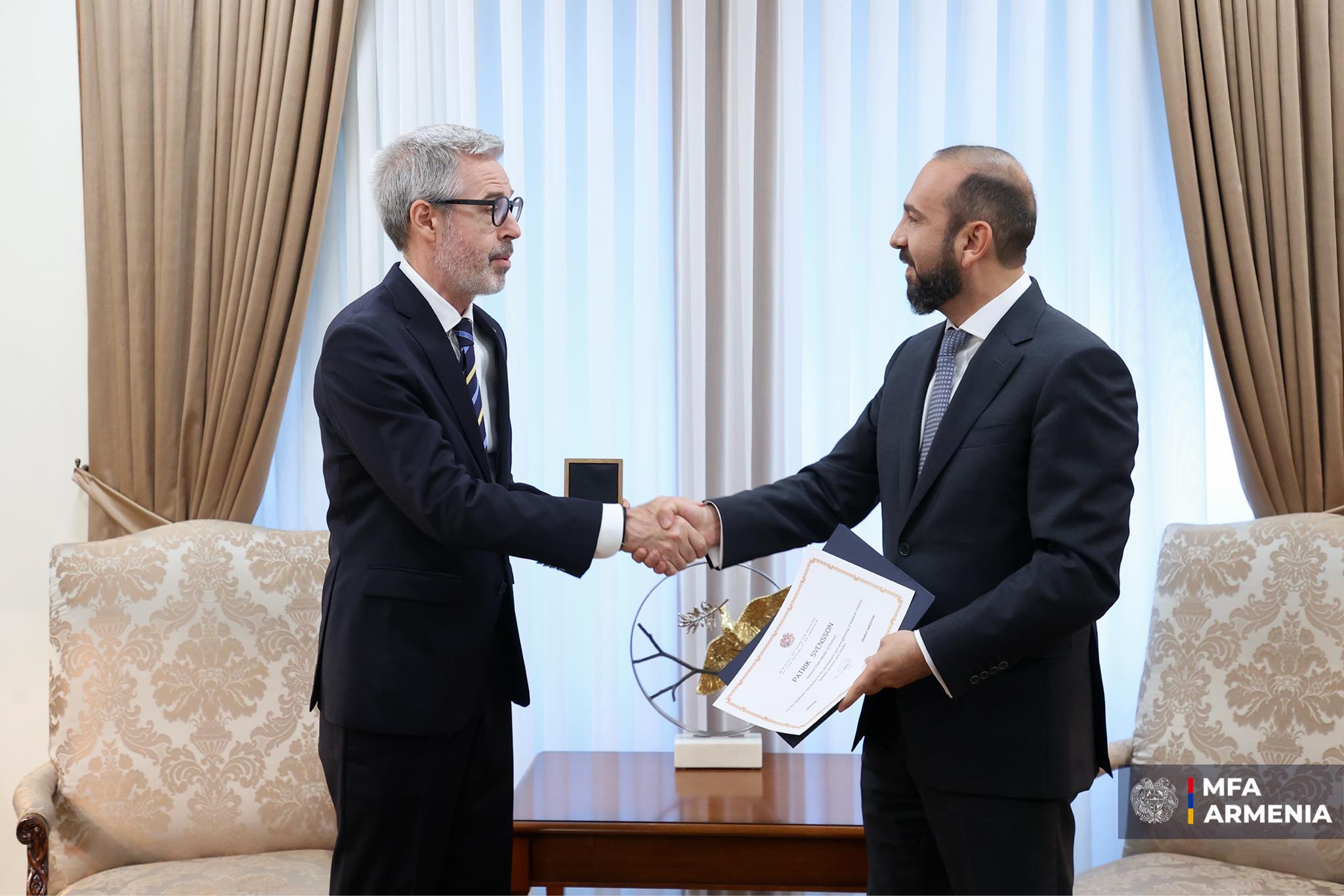 Արդյունավետ աշխատանքի և երկկողմ հարաբերությունների առաջխաղացման գործում ներդրած ավանդի համար նախարար Միրզոյանը դեսպան Պատրիկ Սվենսոնին պարգևատրել է ԱԳՆ պատվո մեդալով՝ նրան հաջողություն մաղթելով հետագա գործունեության մեջ: