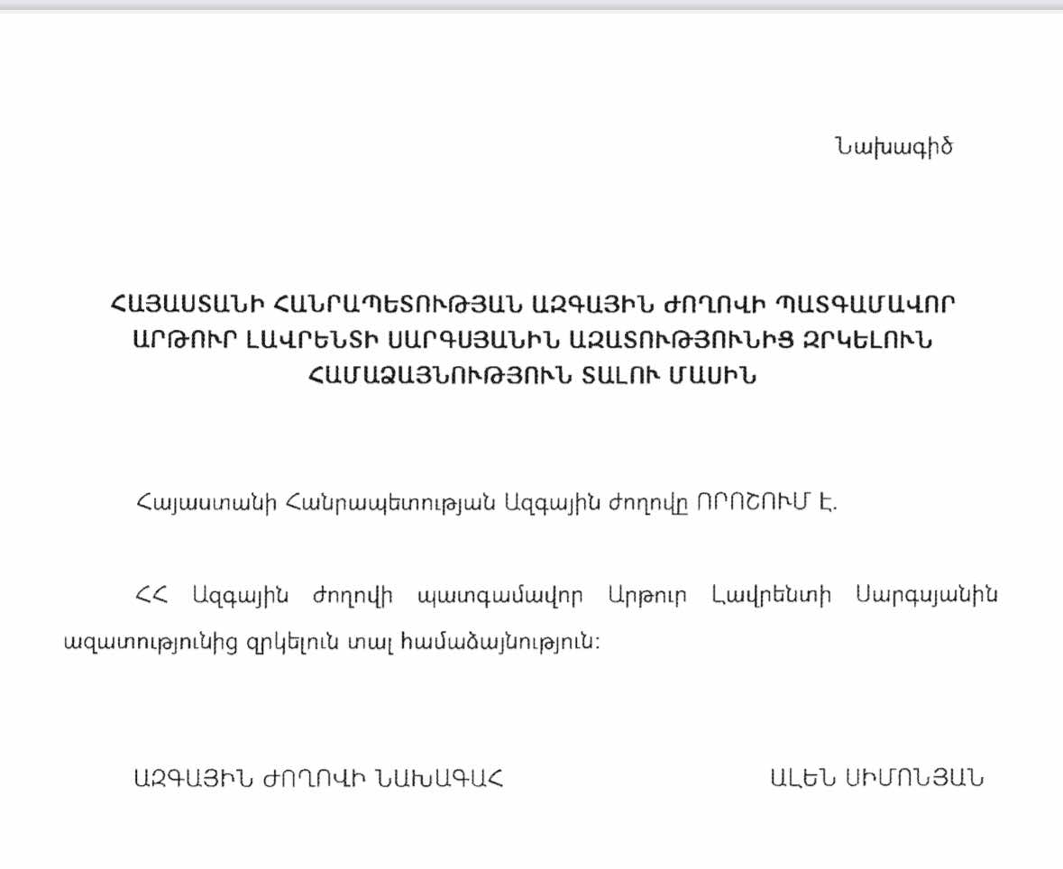 ArmLur.am-ը տեղեկացավ, որ ՀՀ Գլխավոր դատախազ Աննա Վարդապետյանը դիմել է ԱԺ նախագահ Ալեն Սիմոնյանին միջնորդագրով, որի համաձայն՝ ոչ միայն քրեական վարույթ է նախաձեռնվելու, այլ նաև միջնորդում է, որ ԱԺ «Հայաստան» խմբակցության պատգամավոր Արթուր Սարգսյանին կալանավորեն։