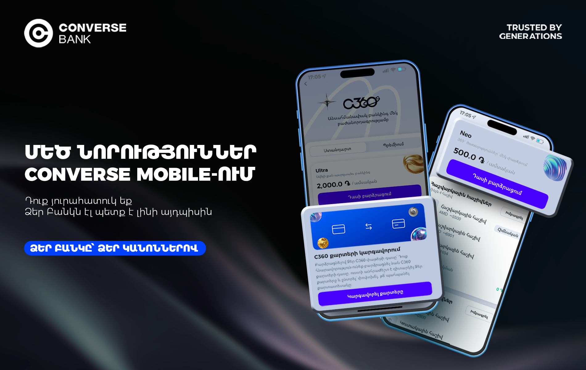 Converse Mobile-ում հաճախորդներին համապարփակ բանկային ծառայություններ մատուցելու նկատառումով զգալիորեն ընդլայնվել է հավելվածում հասանելի ծառայությունների ցանկը և հնարավորությունները: Մասնավորապես.
