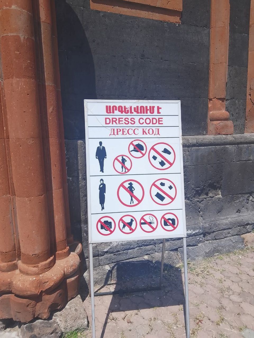 Գյումրու Սուրբ Ամենափրկիչ եկեղեցու մուտքի մոտ դրված այս ցուցանակը հուշում է՝ հոգեւոր տարածք մուտք գործելիս պարտադիր է համեստ հագուստ, զսպված վարք. թեպետ տարօրինակ է, որ եկեղեցի մուտք գործելու համար նման հիշեցման անհրաժեշտություն կա։