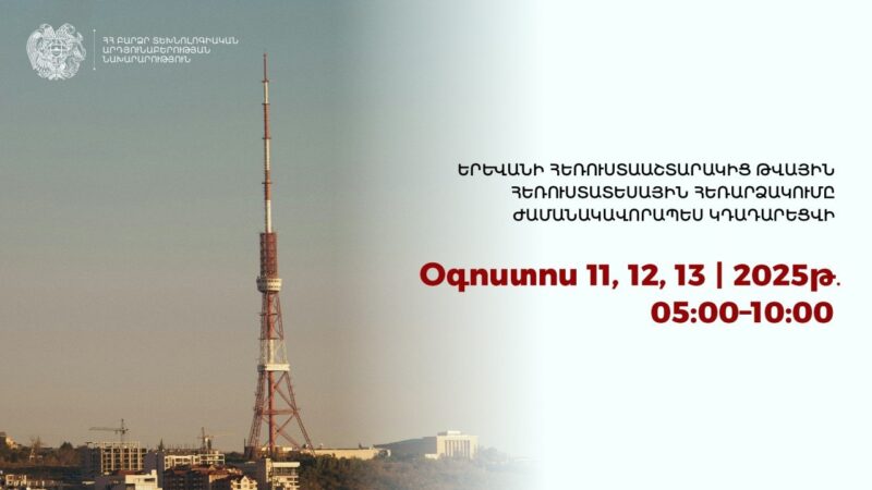 «Հայաստանի հեռուստատեսային և ռադիոհաղորդիչ ցանց» ընկերությունը տեղեկացնում է, որ Երևանի հեռուստաաշտարակի գեղազարդ լուսավորման նոր համակարգի մոնտաժային աշխատանքներով պայմանավորված՝ օգոստոսի 11-ին, 12-ին և 13-ին՝ ժամը 05։00-10։00-ն ընկարծ ժամանակահատվածում, Երևանի հեռուստաաշտարակից թվային հեռուստատեսային հեռարձակումը կդադարեցվի: