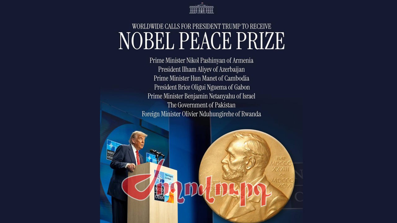 Երեկ ուշ երեկոյան Սպիտակ Տան սոցիալական էջերում հրապարակում արվեց, որում նշվում է, որ աշխարհը կոչ է անում, որ նախագահ Թրամփը ստանա Նոբելյան խաղաղության մրցանակ: Հրապարակման մեջ նաև նշվում է, որ Դոնալդ Թրամփը խաղաղության նախագահն է: