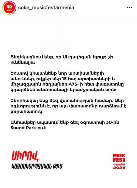 Փառատոնի պաշտոնական հաղորդագրության մեջ նշվում է. «Տեղեկացնում ենք, որ Սևդալիզան ելույթ չի ունենալու: Շուտով կհայտնենք նոր արտիստների անուններ, ովքեր մեր 15 հայ արտիստների և միջազգային հեդլայներ A7S-ի հետ փառատոնը կդարձնեն անմոռանալի երաժշտական տոն… Անհամբեր սպասում ենք ձեզ օգոստոսի 30-ին՝ Sound Park-ում»։