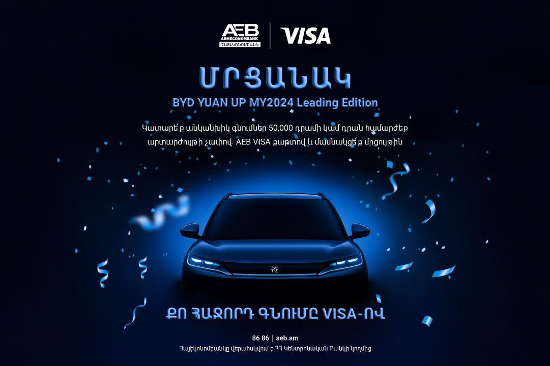 2025թ. սեպտեմբերի 1-ից մինչև 2025թ. հոկտեմբերի 31-ը կատարելով անկանխիկ գնումներ 50,000 դրամի կամ դրան համարժեք արտարժույթի չափով AEB VISA քարտով` հաճախորդները կարող են մասնակցել BYD YUAN UP MY2024 էլեկտրական մեքենայի մրցույթին։