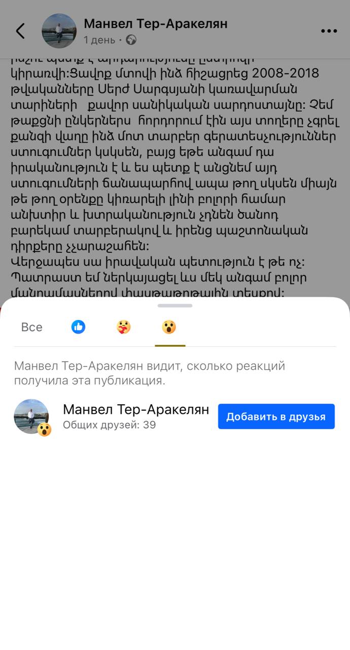 Հետքրքիրն այն է, որ գրելուց հետո Տեր-Առաքելյանն ինքն իր հրապարակմանն արձագանքել էր «զարմանքի» սմայլիկով։ Սա դիտմամբ է, թե պատահմամբ դժվար է ասել, սակայն ակնհայտն այն է, որ Մանվել Տեր-Առաքելյանն էլ չի կողմնորոշվում որն է ճշմարիտը;