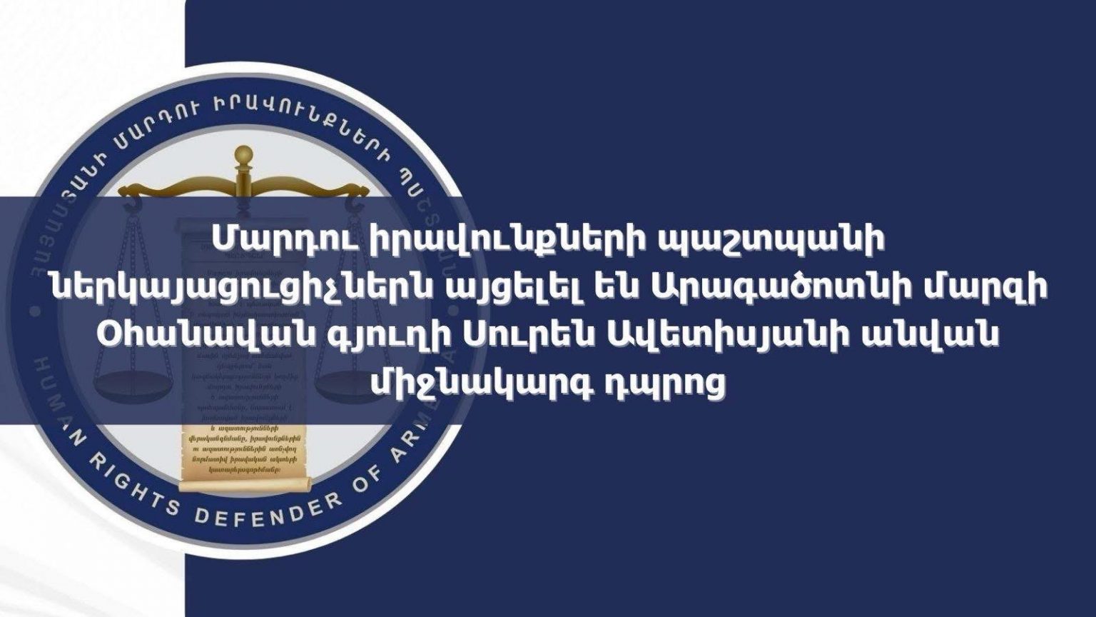 Մարդու իրավունքների պաշտպանի ներկայացուցիչները սեպտեմբերի 2-ին այցելել են Արագածոտնի մարզի Օհանավան գյուղի Սուրեն Ավետիսյանի անվան միջնակարգ դպրոց, հայտնում են Պաշտպանի աշխատակազմից։