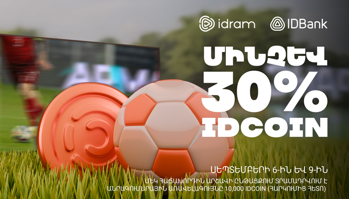 Այսպիսով, Հայաստան-Պորտուգալիա ֆուտբոլային հանդիպման օրը՝ 2025թ․ սեպտեմբերի 6-ից մինչև սեպտեմբերի 7-ը ժամը 03։00-ն, ինչպես նաև Հայաստան – Իռլանդիա խաղի օրը՝ սեպտեմբերի 9-ից մինչև սեպտեմբերի 10-ը ժամը 03։00-ն, վճարելով Idram&IDBank հավելվածով ներքևում նշված վաճառակետերում՝ հաճախորդները կստանան մինչև 30% ակնթարթային idcoin (ներառյալ հարկերը)․