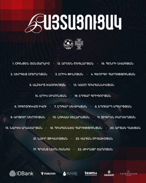 ՀՖՖ մամուլի ծառայությունը հրապարակել է Հայաստանի ազգային հավաքականի հայտացուցակը ԱԱ-2026-ի եվրոպական գոտու որակավորման փուլի F խմբի առաջին տուրում Պորտուգալիայի դեմ խաղի համար։
