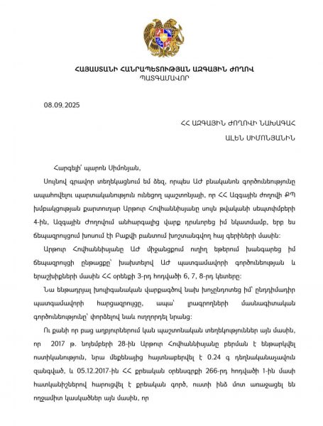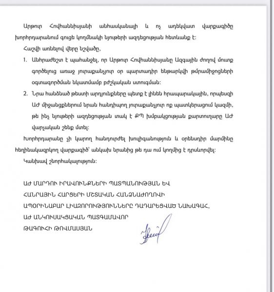 ԱԺ ընդդիմադիր պատգամավոր Թագուհի Թովմասյանը Ազգային ժողովի նախագահից պաշտոնական գրությամբ պահանջել է, որ ՔՊ խմբակցության քարտուղար Արթուր Հովհաննիսյանը Ազգային ժողով մտնի միայն թմրանյութիազդեցության թեստ հանձնելուց հետո: