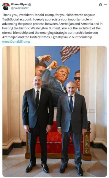 Շնորհակալություն, նախագահ Դոնալդ Թրամփ, Ձեր TruthSocial էջում արտահայտած ջերմ խոսքերի համար։ Ես խորապես գնահատում եմ Ձեր կարևոր դերը Ադրբեջանի և Հայաստանի միջև խաղաղ գործընթացի առաջմղման և Վաշինգտոնի պատմական գագաթնաժողովի կազմակերպման գործում։ Այս մասին X-ի իր էջում գրել է Ադրբեջանի նախագահ Իլհամ Ալիևը։