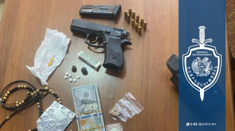 Նրա խուզարկությամբ հայտնաբերվել են ատրճանակ, փամփուշտներ, թմրամիջոցի նմանվող 4 գրամից ավելի շագանակագույն զանգված և այլն։