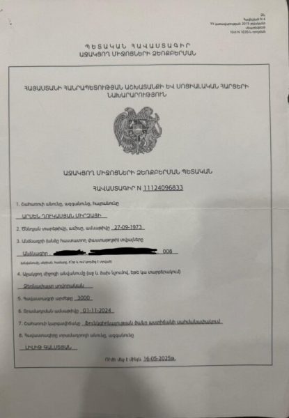Կից Արսեն Ղուկասյանին ձեռնափայտ ցուցված լինելու հավաստագիրն է»: