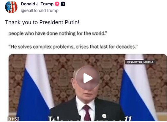 «Շնորհակալություն, նախագահ Պուտին», – գրել է Թրամփը TruthSocial սոցիալական ցանցում։ Ամերիկացի առաջնորդը նաև կիսվել է Ռուսաստանի նախագահի ելույթի մի հատվածով։ Այնտեղ Պուտինը նշել է, որ Թրամփը «շատ բան է անում այս բարդ ճգնաժամերը լուծելու համար, որոնք տևում են տարիներ, նույնիսկ տասնամյակներ»։