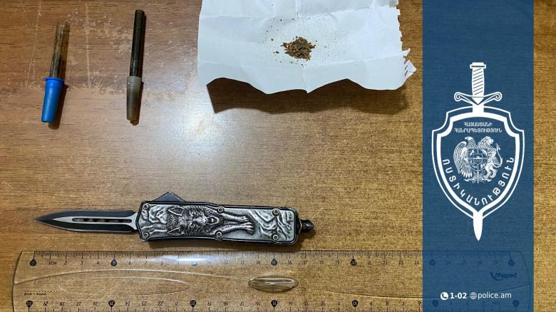 Նրա անձնական խուզարկությամբ հայտնաբերվել են 2 գլանակ, որոնցից մեկը՝ կիսամոխրացած հետքերով, մյուսը՝ բուսական զանգվածով, 1,28 գրամ մարիխուանա, մոտ 1 գրամ կոկաին և գաղտնի փականով դանակ։