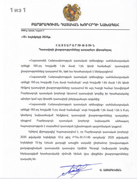 Քիչ առաջ ArmLur.am-ին հայտնի դարձավ, որ դատավոր Արմինե Սաֆարյանի լիազորությունները դադարեցվել են։