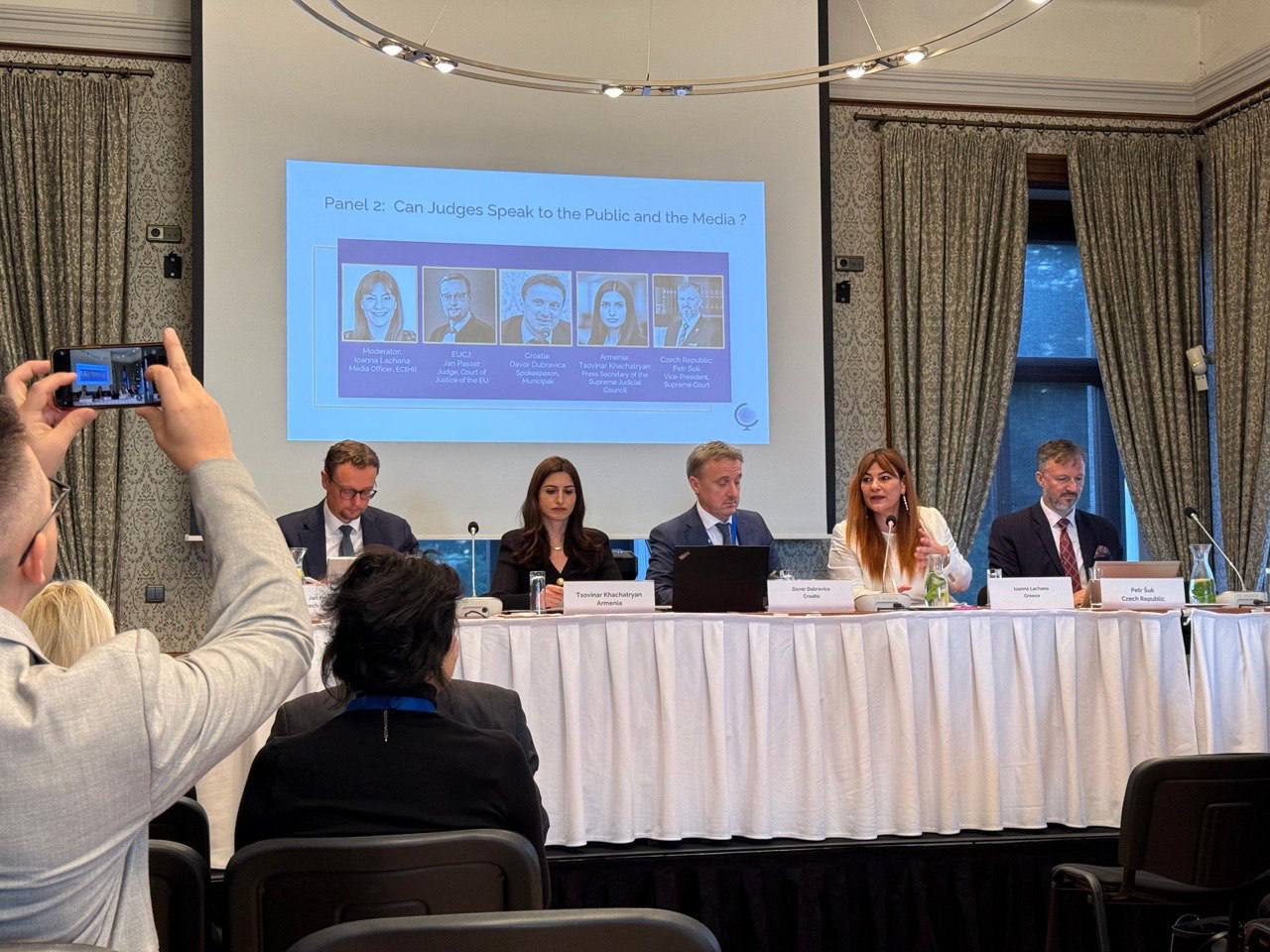Ծովինար Խաչատրյանը ներկայացրել է հստակ հաղորդակցման, հակասություններից խուսափելու և ուղերձների հասցեականությունը ապահովելու անհրաժեշտությունը։ Յան Պասսերը ներկայացրել է եվրոպական փորձը՝ նշելով, որ հանրային վստահությունը պահելու համար միջազգային դատարանները խիստ խուսափում են քաղաքական ենթատեքստից։ Դավոր Դուբրավիցանը խոսել է դատավորների վարքագծի միջազգային չափանիշների ու հանձնարարականների մասին՝ հիմնվելով Վենետիկի հանձնաժողովի, CCJE-ի և ՄԱԿ-ի Բանգալորյան սկզբունքների վրա։ Պետր Սուկը ներկայացրել է դատավոր-խոսնակի մոդելի առանձնահատկությունները և խոսել դատարանի անունից հանդես եկող դատավորների պատասխանատվության ու չեզոքություն պահպանելու կարևորության մասին։