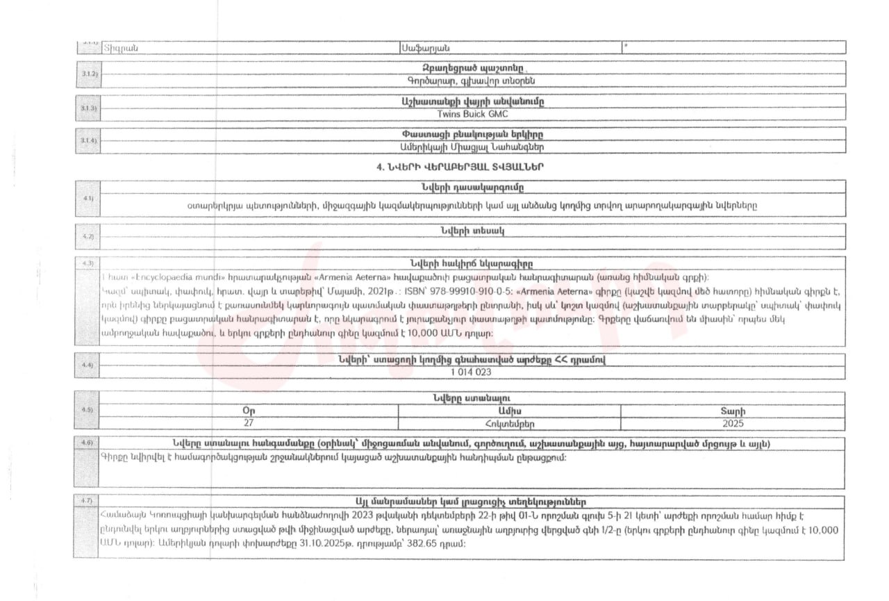 Հանդիպման ընթացքում Մակունցին Սաֆարյանը նվիրել է 1 մլն 14 հազար դրամ արժեցող հանրագիտարան՝ 1 Encyclopaedia mundi հրատարակչության, Armenia Aeterna հավաքածուի բացատրական հանրագիտարան առանց հիմնական գրքի։ Armenia Aeterna գիրքը հիմնական գիրքն է, որը պարունակում է 41 կարեւորագույն պատմական փաստաթղթերի ընտրանի, իսկ սեւ կոշտ կազմով գիրքը բացատրական հանրագիտարան է, որը նկարագրում է յուրաքանչյուր փաստաթղթի պատմությունը։ Գրքերը վաճառվում են միայն որպես մեկ ամբողջական հավաքածու, եւ երկու գրքերի ընդհանուր արժեքը կազմում է 10 հազար ԱՄՆ դոլար»։