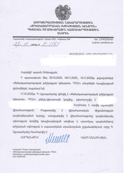 Այնուհետև, Միքայել Սրբազանի պաշտպանի կողմից 29.10.2025թ., 06.11.2025թ. և 10.11.2025թ. «Քրեակատարողական բժշկության կենտրոն» ՊՈԱԿ-ին հասցեագրվել են դիմումներ: Դիմումներով ներկայացվել են համապատասխան բժշկական փաստաթղթեր, Միքայել Սրբազանի գրավոր համաձայնությունը և ՊՈԱԿ-ից ակնկալվել է միջոցներ ձեռնարկել Միքայել Սրբազանի վիրահատությունը, ինչպես նաև մեկ այլ հիվանդության բուժումը «Իզմիրլյան» բժշկական կենտրոն ՓԲԸ-ի միջոցով կազմակերպելու կապակցությամբ: Մեր տեղեկություններով, Միքայել Սրբազանին ՊՈԱԿ-ից առաջարկել են, բացի «Իզմիրլյան» բժշկական կենտրոն ՓԲԸ-ից այլ հիվանդանոց ընտրել, սակայն Միքայել Սրբազանը պատճառաբանել է, որ իր հիվանդությունների բուժումն անցել է «Իզմիրլյան» բժշկական կենտրոնում, ունի բժիշկ և վստահում է այդ հիվանդանոցին ու բժշկին: 28.11.2025թ. գրությամբ «Քրեակատարողական բժշկության Կենտրոն» ՊՈԱԿ տնօրենը ընդունելով, որ անհրաժեշտ է պլանային վիրահատություն, միայն նշել է, որ անվճար բժշկական օգնությունից Միքայել Սրբազանը հրաժարվել է: