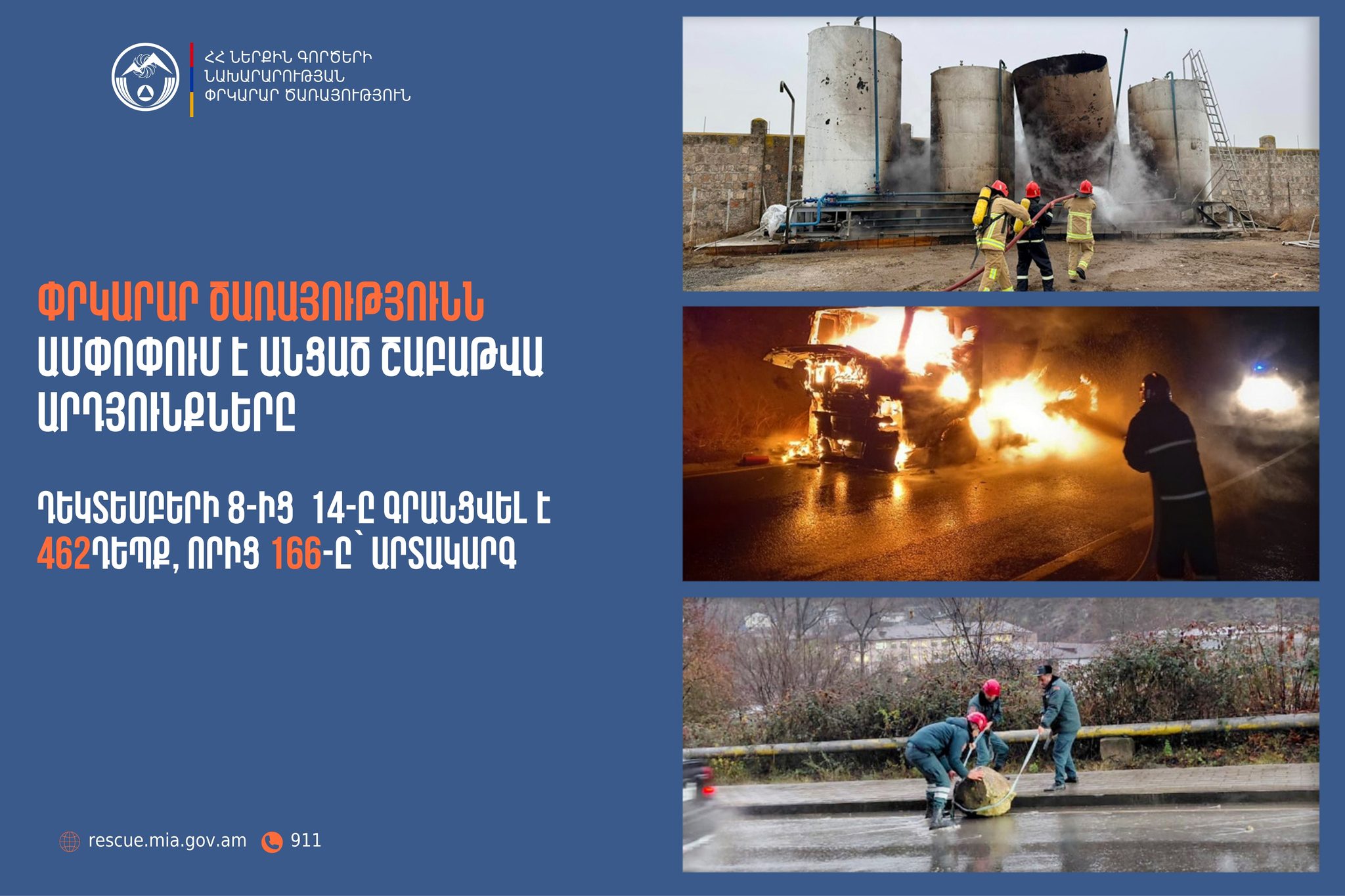 Դեկտեմբերի 8-ից 14-ը ՆԳՆ ՓԾ ճգնաժամային կառավարման ազգային կենտրոնում գրանցվել է 462 դեպք, որից 166-ը՝ արտակարգ: