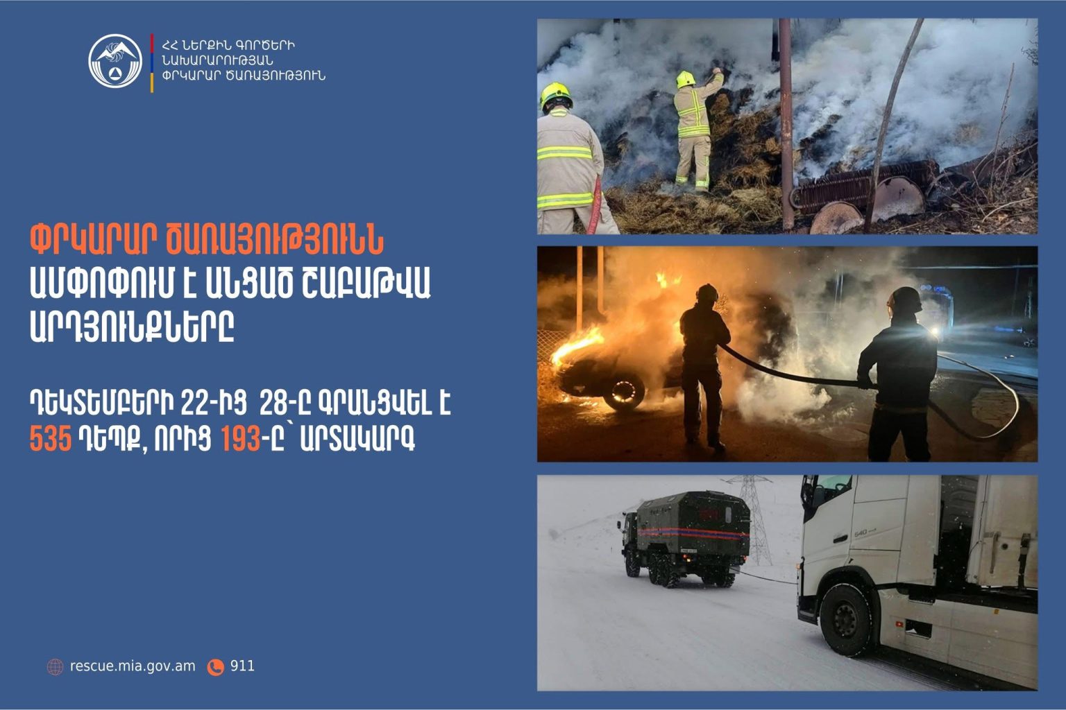 Դեկտեմբերի 22-ից 28-ը ՆԳՆ ՓԾ ճգնաժամային կառավարման ազգային կենտրոնում գրանցվել է 535 դեպք, որից 193-ը՝ արտակարգ: