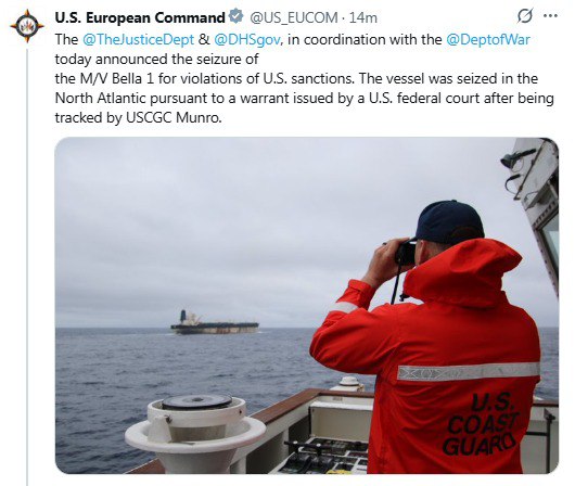 ԱՄՆ-ն վերահսկողության տակ է վերցրել ռուսական դրոշի ներքո Մեծ Բրիտանիայի մոտակայքում գտնվող Marinera նավթային լցանավը: Ըստ Reuters գործակալության և ԱՄՆ Եվրոպական հրամանատարության պաշտոնական հաղորդագրության՝ նավը կալանավորվել է ամերիկյան դաշնային դատարանի որոշման հիման վրա՝ Ատլանտյան օվկիանոսով ավելի քան երկու շաբաթ տևած հետապնդումից հետո։ Սա վերջին տասնամյակների ընթացքում առաջին դեպքերից է, երբ ամերիկյան զինվորականները բացահայտ ուժային գործողություն են իրականացնում Ռուսաստանի պետական դրոշը կրող լցանավի նկատմամբ։