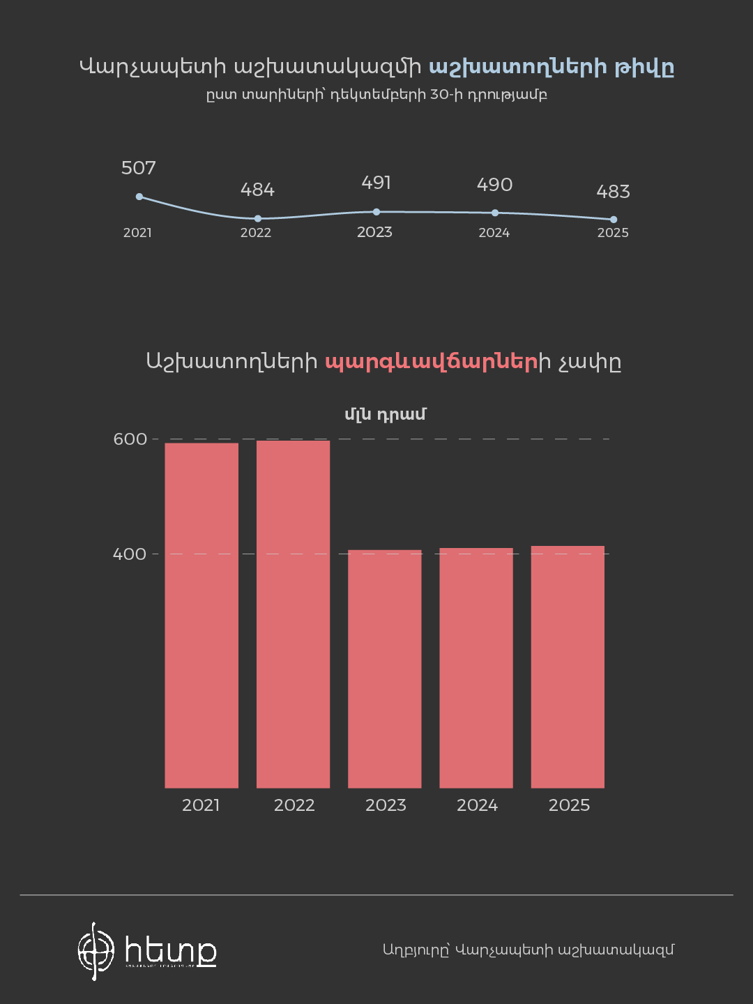 Վարչապետի աշխատակազմի աշխատողները (թիվն ամեն տարի փոփոխվում է, միջինը` 491 մարդ), վարչապետն ու երկու փոխվարչապետները 2021-2025 թվականներին ստացել են ընդհանուր 2 մլրդ 835 մլն 550 հազ. դրամ պարգևատրում և պարգևավճար: «Հետքը» գրավոր հարցմամբ Կառավարությունից տեղեկատվություն է ստացել վարչապետի աշխատակազմի, վարչապետի եւ փոխվարչապետների 2021-2025թթ. ստացած պարգևավճարների վերաբերյալ: