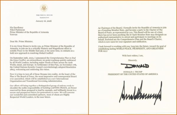 Վարչապետ Նիկոլ Փաշինյանը ստացել է ԱՄՆ նախագահ Դոնալդ Թրամփի պաշտոնական հրավերը՝ Խաղաղության խորհրդին որպես հիմնադիր անդամ միանալու վերաբերյալ։