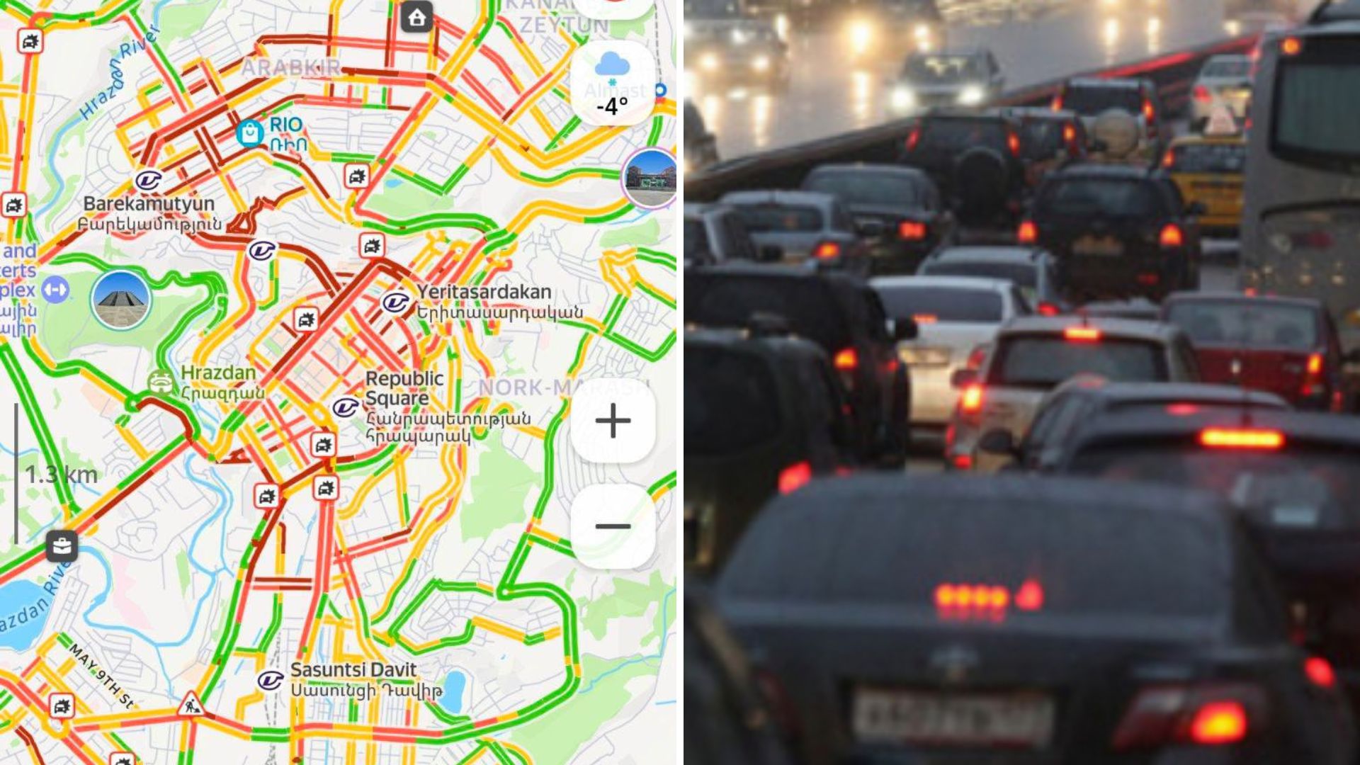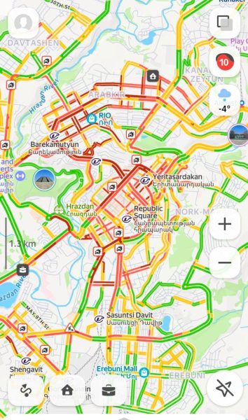 Ըստ Yandex քարտեզի՝ Երևանում դիտվում է 10 բալանոց խցանում: